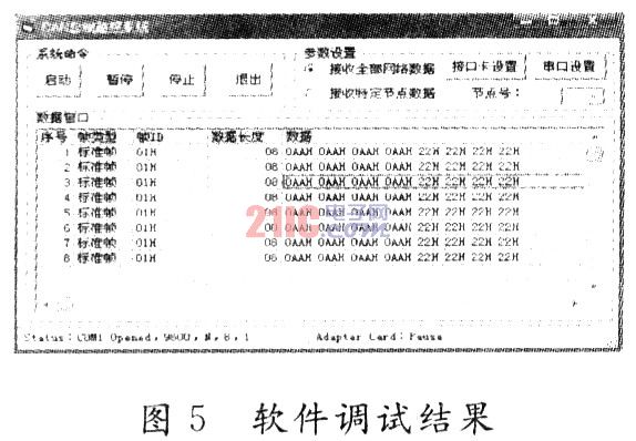 在該接口卡中作者采取了另一種轉義字符的方法。首先定義一個轉義字符標識OXDBH。對于CAN總線而言,其每個幀的最大數據長度為8,即使將CAN的幀信息和識別碼全部當作數據發送,其長度最大也只有13B。這樣可以肯定的是,正常情況下數據幀中數據長度字節的高4位必然為0。因此在數據發送之前,首先檢查該數據中是否有與起始字節0X22H、結束字節0X33H和轉義標識0XDBH相同的數據,如果沒有,則正常發送;如果有,則檢測出與這兩個字節相同數據的個數,并將該個數填充到數據長度字節的高4位中;同時,將這些數據前添加轉義字符標識,并將該數據進行轉義。如數據0X22H。0X33H,0XDBH…,則轉義成0XDBH。0XD2H。0XDBH,0XD3H,0XDBH,0XDDH…。PC機在接收到數據幀后,首先檢查數據長度字節,看其高4位是否為0,如果為0,說明該數據組不存在轉義字符,可以直接處理;如果為N。則表明數據組中存在N個轉義字符,并且每個轉義字符都以0XDB開始,需要首先將它們重新修改回原始數據。相比而言,這種辦法有很好的穩定性和接口利用率,其數據流量也不會很高。