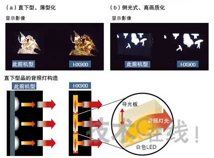HX900將多個白色LED集成于一個單元,并鋪設在面板背面。單元內LED發光的方向與面板平行,利用導光板等使光照射到面板背面。索尼表示,面板模組厚度“不便公開,但比現有的直下式LED背照燈要薄。”(注2)因每個單元的LED背照燈亮度可視面板的顯示需要而控制,因此對比度也可提高。