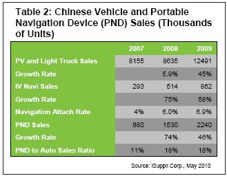 盡管2009年中國(guó)市場(chǎng)的乘用車(chē)(PV)和輕型卡車(chē)銷(xiāo)量接近1230萬(wàn)輛,躍居全球最大的汽車(chē)市場(chǎng),但包括OEM和售后in-dash在內(nèi)的車(chē)載導(dǎo)航配售率只有7%左右。