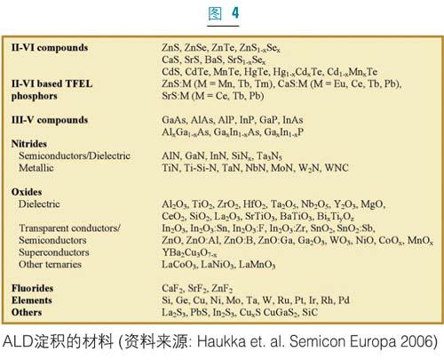 因?yàn)锳LD在半導(dǎo)體制造的不同領(lǐng)域都經(jīng)過(guò)評(píng)估和采用,所以選擇合適的原始反應(yīng)物(precursor)就變得日益重要。ALD原始反應(yīng)物應(yīng)當(dāng)具備幾個(gè)“理想”的品質(zhì),即要具有一定的揮發(fā)性和可重復(fù)的汽化率;理想情況下不應(yīng)在反應(yīng)溫度下發(fā)生自身反應(yīng)或分解;應(yīng)當(dāng)極易與補(bǔ)充反應(yīng)物發(fā)生反應(yīng);應(yīng)能產(chǎn)生可揮發(fā)的副產(chǎn)品;基于生長(zhǎng)速率和成核的原因應(yīng)具有最佳的配合基尺寸。為了使用方便,原始反應(yīng)物最好為液體有機(jī)金屬物,但是薄膜的性質(zhì)和應(yīng)用指標(biāo)(如雜質(zhì)含量、電學(xué)特性等)應(yīng)該決定材料的選擇。另外,對(duì)制備成本的關(guān)注也要求反應(yīng)源能與傳統(tǒng)的制備工藝在成本上更有競(jìng)爭(zhēng)性。ALD具有很高的反應(yīng)源的使用效率,這通常能平衡新反應(yīng)源的高價(jià)格。隨著ALD進(jìn)入大規(guī)模生產(chǎn),并且工業(yè)界減少對(duì)反應(yīng)源的選擇,對(duì)成本的顧慮將可能會(huì)隨著化學(xué)品供應(yīng)商規(guī)模化其生長(zhǎng)流程而減輕。利用現(xiàn)有的反應(yīng)源,目前人們已經(jīng)可以制備多種多樣的ALD薄膜(圖4)。