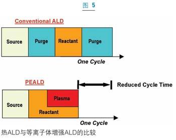雖然ALD最初僅被視為一個(gè)純粹的熱工藝,但是對(duì)基本的原子層淀積循環(huán)的微小變更已經(jīng)提出了多年。最常見(jiàn)的變種是等離子體增強(qiáng)原子層沉積工藝(PEALD)。PEALD可取消原子層淀積中的一個(gè)步驟,從而進(jìn)一步縮短生產(chǎn)周期。PEALD過(guò)程中,在淀積溫度下互不發(fā)生反應(yīng)的互補(bǔ)反應(yīng)源在同一時(shí)間被引入到反應(yīng)室,然后反應(yīng)源關(guān)閉并凈化反應(yīng)室,接著施加一個(gè)直接的等離子脈沖,這個(gè)等離子體環(huán)境產(chǎn)生高活性自由基并與吸附于襯底的反應(yīng)物反應(yīng)。關(guān)閉等離子可迅速清除活性自由基源,反應(yīng)室中一直流過(guò)的清潔氣體將清除過(guò)剩自由基和反應(yīng)副產(chǎn)物(圖5)。除了較高的生長(zhǎng)速度和較短的周期時(shí)間,PEALD薄膜表現(xiàn)出比傳統(tǒng)的原子層淀積薄膜更高的密度和更高的擊穿電壓。該技術(shù)已經(jīng)在多個(gè)應(yīng)用中取得了發(fā)展,如DRAM、MIM和eDRAM電介質(zhì)薄膜。不過(guò)在一些關(guān)鍵的薄膜應(yīng)用中,如高功率柵介質(zhì),等離子損傷以及界面氧化的顧慮阻礙了PEALD技術(shù)的廣泛應(yīng)用。