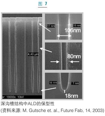 最近,Al2O3/HfO2以及Al2O3/ZrO2結(jié)構(gòu)也引起了人們的關(guān)注。PEALD也已經(jīng)用于eDRAM中。電容滿足所有的要求,即等效氧化層厚度要小于8埃,125攝氏度時(shí)漏電流要小于1fA/cell,工作電壓為1伏時(shí)壽命要大于十年。圖7為典型的ALD薄膜在深槽結(jié)構(gòu)的保角性和動(dòng)態(tài)存儲(chǔ)器生產(chǎn)中的半球形硅晶結(jié)構(gòu),金屬ALD薄膜,例如氮化鈦(TiN)也廣泛應(yīng)用于動(dòng)態(tài)存儲(chǔ)器制造中的電容電極。