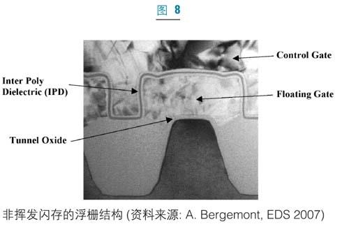 在非揮發(fā)性存儲(chǔ)器的應(yīng)用中,人們也開(kāi)始研究ALD在介質(zhì)和金屬淀積中的應(yīng)用。閃存技術(shù)主要由浮柵(floatinggate)技術(shù)主導(dǎo)(圖8)。高k電介質(zhì)目前正被研究作為二氧化硅(SiO2)和氮化硅(Si3N4)柵介質(zhì)的替代品,以改善浮柵和控制柵之間的電容耦合率。到2010年,浮柵技術(shù)可望被一些技術(shù)所取代,例如電荷捕獲存儲(chǔ)器(TANOS,NROM),相變存儲(chǔ)器(PCM)、鐵電記憶體(存儲(chǔ)器),三維堆疊式存儲(chǔ)器也正在研究中。ALD已被用作這些技術(shù)的阻擋層和擴(kuò)散阻擋層。