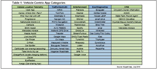 表1為iSuppli公司認定的一些以汽車為中心的智能手機應用程序。