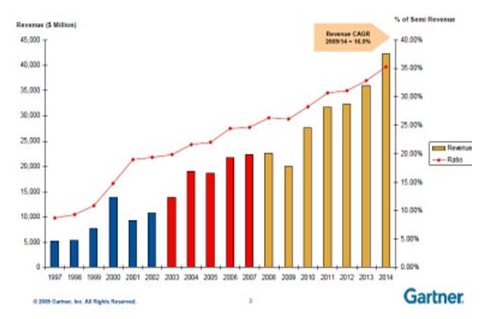 桉Gartner觀察,在明年的Q4時,僅TSMC,GlobalFoundries及三星加在一起,在45nm及以下制程的300mm硅片月產能達約280,000片,而2009 Q4時僅70,000片。今年TSMC與GlobalFoundries兩家計劃總投資達79億美元。