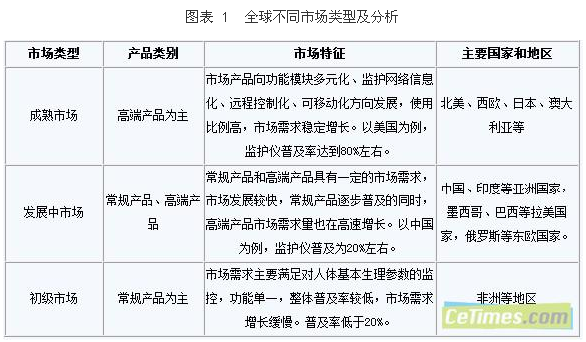 醫療設備的發展與國家和地區的經濟發展水平、醫療政策以及當地居民收入水平息息相關,這些因素導致全球醫療監護儀市場發展不平。根據市場特征以及對產品需求的不同可以將醫療監護儀市場分為成熟市場、發展中市場和初級市場。