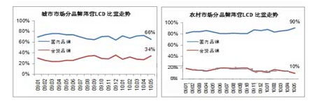 尤其在節慶期間,外資品牌大規模的降價促銷,使得國內電視品牌城市市場的規模及利潤大幅縮減。2010年五一前,外資品牌重點在32英寸的2499/2999元兩個定價點,逐步擴張城市中低端市場。從五一開始,外資品牌將策略延伸至大尺寸,40英寸平板電視價格低至4499元,將內外資品牌電視價差降至500元以內,對國產品牌產生較大沖擊。不過,在農村市場,國內電視企業面對家電下鄉政策帶來的巨大機會,可憑借一貫的本土優勢全力彌補城市市場的份額損失,從而使其與外資電視品牌市場份額比例保持在7:3(見圖3)。