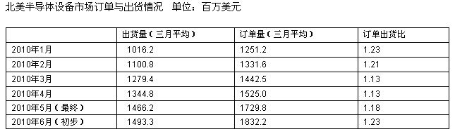 SEMI日前公布了2010年7月份北美半導體設備制造商訂單出貨比報告。按三個月移動平均額統計,7月份北美半導體設備制造商訂單額為18.3億美元,訂單出貨比為1.23。訂單出貨比為1.23意味著該月每出貨價值100美元的產品可獲得價值123美元的訂單。