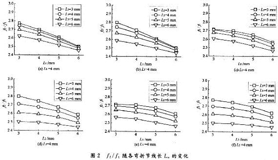 圖2示出了天線f2/f1隨各彎折節線長Ln的變化情況。圖2中,W=58mm,L=38mm,LG=17mm,HB=3mm,S1=S2=S3=1mm,W1=W2=W3=2mm。