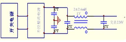 第二種方法的抗干擾設計考慮如圖8所示,圖中在交流輸入通道上設計線路濾波器對系統抗干擾具有很好的作用。其中CX為差模濾波電容(又稱X電容)跨接在輸入端之間,對差模電流起旁路作用,容值一般為0.1—1uF.LY為共模電感,用來抑制共模干擾電流。CY為共模電容(又稱Y電容),跨接在線路與機殼之間,對共模電流起旁路作用,但電容值不能過大,否則會超過安全標準中對漏電流的限制要求,一般在10000PF以下。