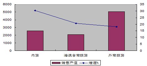 三資企業實現銷售產值7132億元,增長18.7%;出口交貨值4932億元,增長14.4%,分別低于行業平均水平2.9和0.4個百分點。其中港澳臺企業銷售產值增長20.7%,外商投資企業增長18.0%。