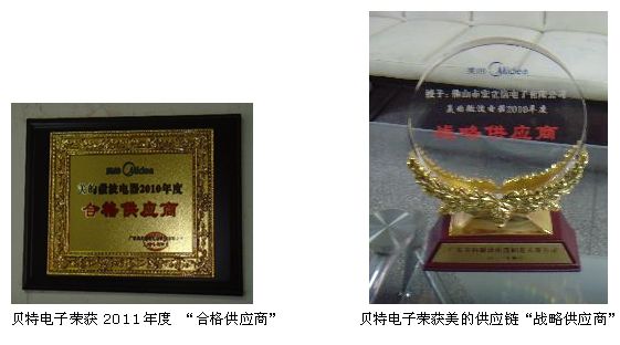 與美的合作近8年來,貝特電子有限公司憑借過硬的產品質量,極強的研發能力,優質的售前售后服務,成功獲得“合格供應商”及“戰略供應商”兩項大獎,并得到獎金3萬元。