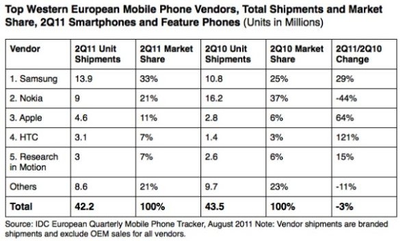 報告顯示,今年第二季度西歐地區(qū)移動產(chǎn)品出貨總量同比下降3%。IDC分析師弗朗西斯科·杰若尼莫(Francisco JerONimo)表示,歐洲嚴峻的經(jīng)濟形勢以及諾基亞發(fā)貨量的直線下降是兩大主要原因。