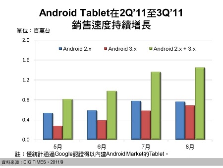 DIGITIMES Research分析師兼項目經(jīng)理林俊吉根據(jù)Google每月公開的連上Android Market 裝置規(guī)格分布比例信息后估算,通過Google認(rèn)證的Android Tablet月銷售量應(yīng)已從2011年第二季的不及百萬臺,在8月份邁入近150萬臺的水平。