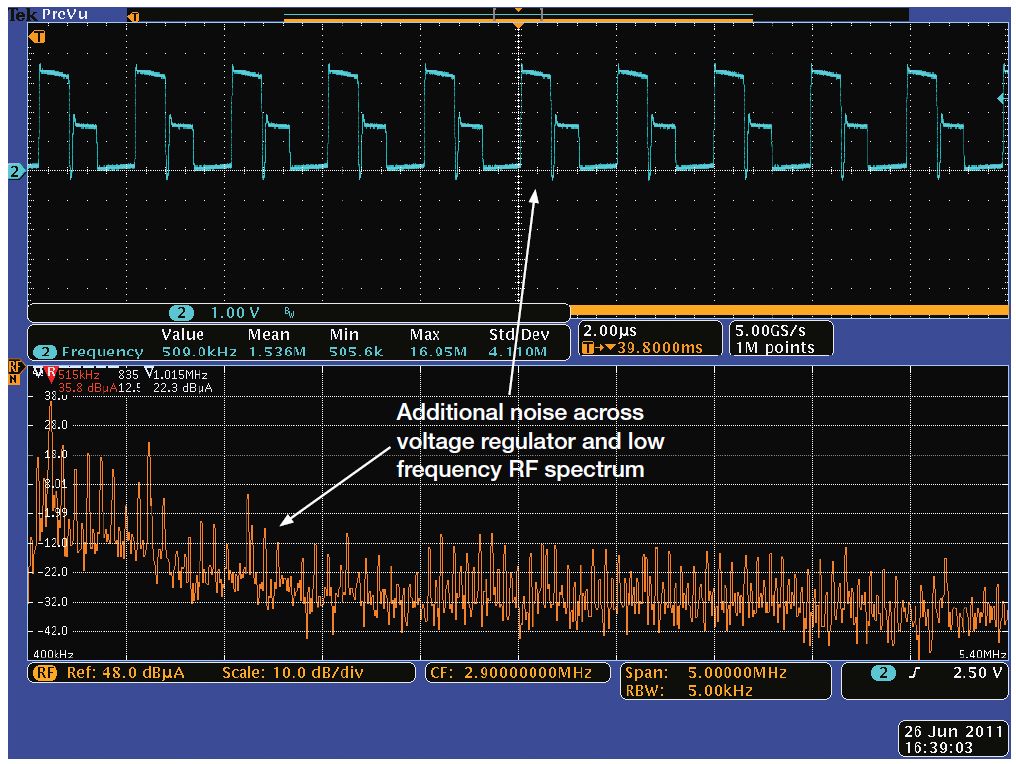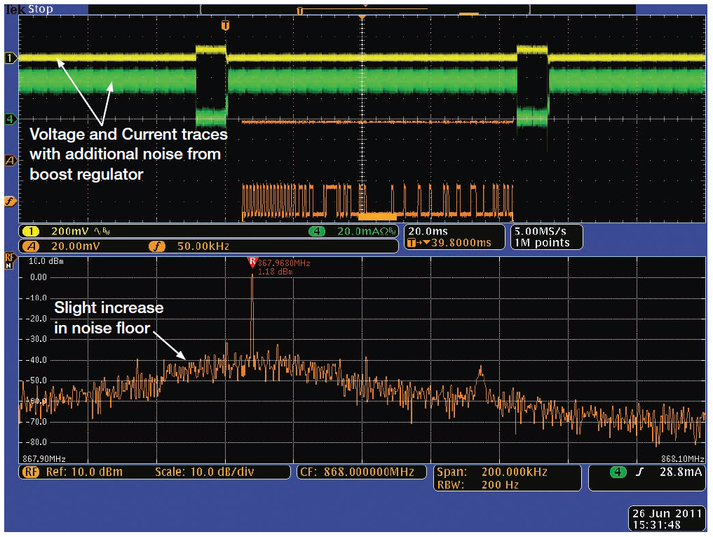 上圖是在使用干凈的實驗室電源供電的模塊中獲得的,這在實際環境中很難實現,但可以作用實用參考。圖4顯示了相同的RF信號,但使用升壓型開關電源為無線電模塊供電。升壓穩壓器因產生噪聲而臭名昭著,但它允許使用一個或兩個堿性或鎳鎘單元及相對較少的器件,降低了成本。注意被調制信號底部的噪聲提高。在發送的信號附近,噪聲至少要比干凈的電源高5 dB。噪聲已經容易地顯現在電流波形和電壓波形中。額外的噪聲還會令從發射機收集這些數據所使用的接收機上的信號信噪比劣化,降低無線電系統的有效范圍。