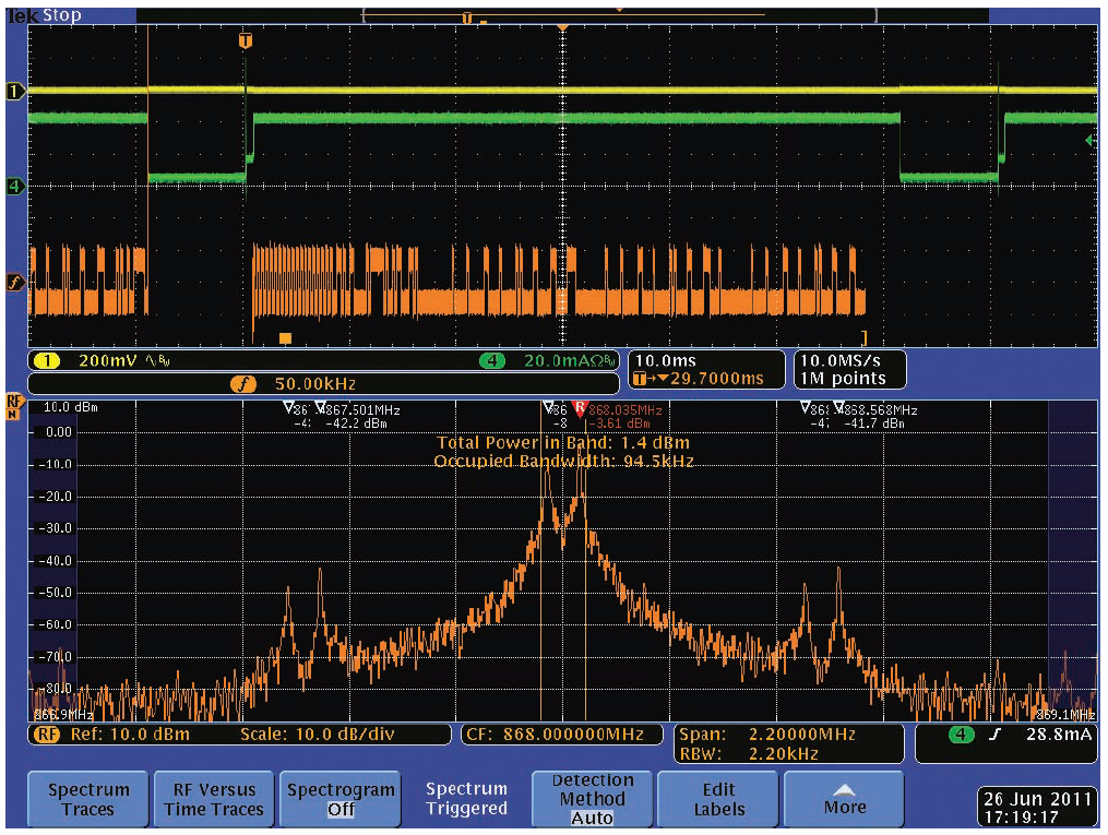我們測量以868 MHz為中心的無線電頻譜,其擁有相當低的2 kbps的FSK調制數據速率,以供參考。圖2顯示了參考頻譜。注意MDO同時顯示時域視圖和頻域視圖,所有信號都時間相關。[page]