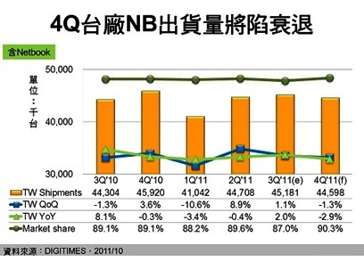2011年第三季返校商機(jī)未顯現(xiàn),已為後續(xù)筆記型(NB)市場買氣不振留下伏筆,DIGITIMES Research 資深分析師兼主任簡佩萍預(yù)估,第四季臺廠 NB 出貨量將再度陷入較上季衰退局勢,幅度為1.3%。全球NB市場則將衰退更多,為4.8%,單季市場規(guī)模恐再度未能達(dá)到5,000萬臺水準(zhǔn),僅及4,939.7萬臺。
