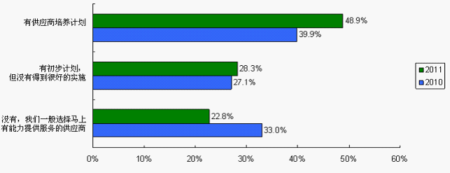 培養(yǎng)供應商有利于建立供求雙方的伙伴關系,提高供應商忠誠度,增強采購風險抵御能力。有供應商培養(yǎng)計劃的系統(tǒng)廠商由2010調(diào)查的39.9%上升至2011調(diào)查的48.9%,而沒有計劃的由2010調(diào)查的33%降至22.8%。