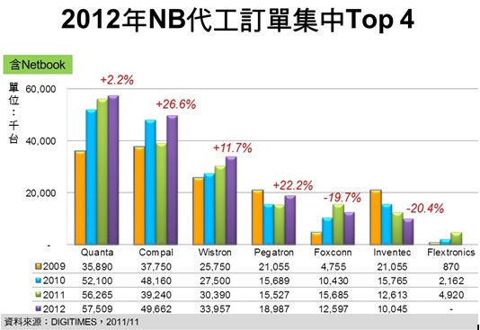 - 2012年NB代工廠將僅前4大業者出貨可成長