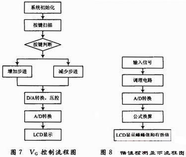 MSP430系列單片機(jī)是美國德州儀器(TI)1996年開始推向市場(chǎng)的一種16位超低功耗的混合處理器(Mixed Signal Processor)。由于它具有極低的功耗、豐富的片內(nèi)外設(shè)和方便靈活的開發(fā)手段,已成為眾多單片機(jī)系列中一顆耀眼的新星。對(duì)于MSP430系列而言,由于引進(jìn)了FLASH型程序存儲(chǔ)器和JTAG技術(shù),不僅使開發(fā)工具變得簡(jiǎn)便,而且價(jià)格也相對(duì)低廉,并且還可以實(shí)現(xiàn)在線編程。程序采用C語言開發(fā)。VCA810的VG控制以及輸出電壓幅值檢測(cè)、顯示的流程圖如圖7、圖8所示。