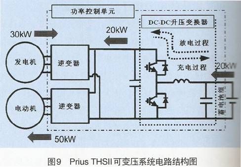 在THS中,蓄電池通過(guò)逆變器直接與電機(jī)和發(fā)電機(jī)相連(見(jiàn)圖8);而THSⅡ中,蓄電池組輸出的電壓首先通過(guò)DC—DC升壓變換器進(jìn)行升壓操作,然后再與逆變器相連,因此逆變器的直流母線電壓從原THS的220V提升為現(xiàn)在的500V。
