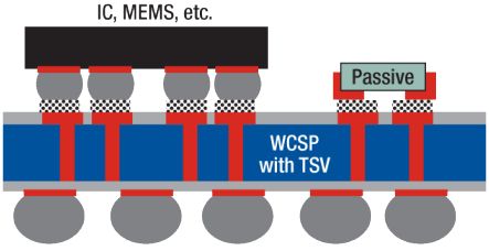 隨著 WCSP 的發展,我們將見證 TSV 互連技術的融合,其提供有源端到裸片后端的電氣連接。這種能力允許 IC 或者其他組件(MEMS、無源組件等)堆疊,從而構建起高集成度的芯片組或者系統級封裝 (SiP) 系統。
