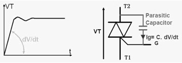 電壓上升率的抵制:dv/dt指的是在關斷狀態下電壓的上升斜率,這是防止誤觸發的一個關鍵參數。此值超限將可能導致可控硅出現誤導通的現象。由于可控硅的制造工藝決定了A2與G之間會存在寄生電容,如圖2所示。我們知道dv/dt的變化在電容的兩端會出現等效電流,這個電流就會成為Ig,也就是出現了觸發電流,導致誤觸發。