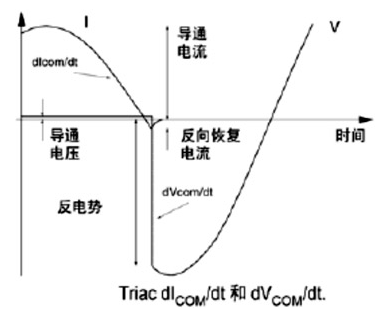 ②dICOM/dt (切換電流變化率) —導致高dICOM/dt值的因素是:高負載電流、高電網頻率(假設正弦波電流)或者非正弦波負載電流,它們引起的切換電流變化率超出最大的允許值,使雙向可控硅甚至不能支持50Hz 波形由零上升時不大的dV/dt,加入一幾mH的電感和負載串聯,可以限制dICOM/dt。