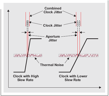 我們在產品說明書中可以找到 ADC 的孔徑口抖動 (aperture jitter)。這一值一般與時鐘振幅或轉換速率一起指定,記住這一點很重要。低時鐘振幅帶來低轉換速率,從而增加窗口抖動。