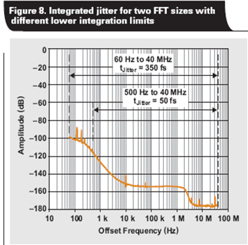 為了進一步描述該點,我們利用兩個不同的FFT尺寸—131,072 和 1,048,576 點,使用 ADS54RF63 進行實驗。采樣速率設定為 122.88MSPS,而圖 8 則顯示了時鐘相位噪聲。我們將一個 6-MHz、寬帶通濾波器添加到時鐘輸入,以限制影響抖動的寬帶噪聲數量。選擇 1-GHz 輸入信號的目的是確保 SNR 減弱僅由于時鐘抖動。圖 8 表明兩個 FFT 尺寸的 1/2 容器尺寸到 40MHz 相位噪聲整合抖動結果都極為不同,而“表 1”的 SNR 測量情況也反映這種現象。