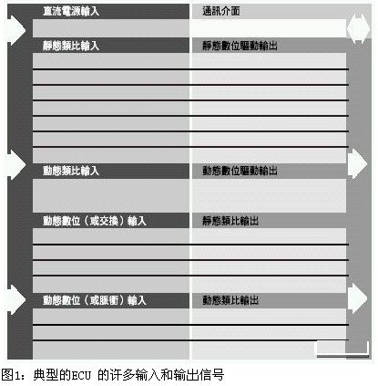 ECU 利用許多信號來監(jiān)控汽車及其環(huán)境,進(jìn)而管理與控制引擎和輔助設(shè)備,以達(dá)到最佳的運(yùn)作狀態(tài)。圖1摘要了典型的ECU 的許多輸入和輸出信號?! ?br />