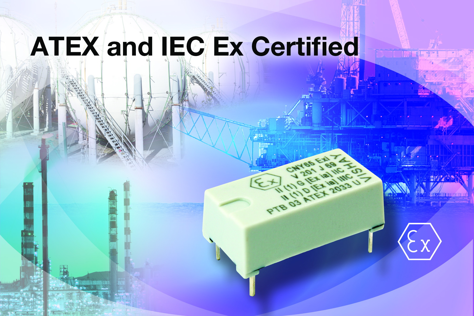 CNY65Exi獲得了ATEX證書PTB 03 ATEX 2033 U,器件具有最高水平的11600V隔離電壓,CTI值達475滿足VDE 0303/DIN 53480的要求。器件滿足ATEX對氣體[II (1) G (Ex ia) IIC]和灰塵[II (1) D (Ex ia) IIIC]的各項規定。