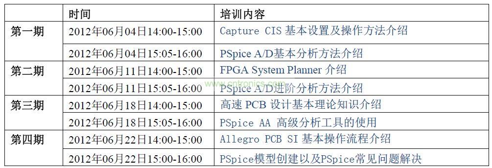 課程分為四期,內容包括Capture CIS、PSpice、FPGA System Planner 以及Allegro PCB SI 培訓。
