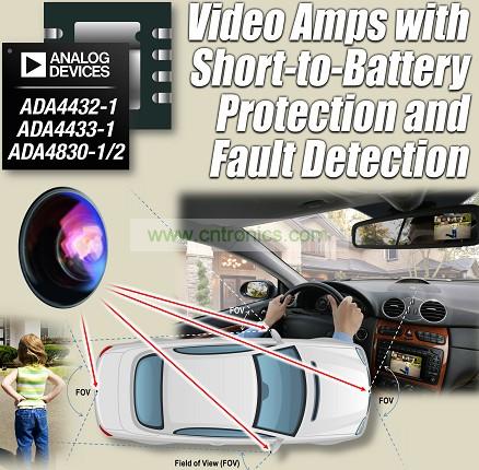 Analog Devices, Inc. ,全球領先的高性能信號處理解決方案供應商,最近推出一系列高速視頻放大器ADA4830-1/2和ADA4432-1/33-1,這些器件集成電池短路保護和故障檢測功能,適合汽車安全和信息娛樂應用中的模擬視頻系統。ADI公司的這些新款集成式視頻放大器采用3mm x 3mm封裝,與完全分立式解決方案相比,電路板空間至少節省80%,非常適合后視攝像頭等空間受限的應用。ADA4830-1(單通道)和ADA4830-2(雙通道)視頻差動放大器以及ADA4432-1(單端輸出)和ADA4433-1(差分輸出)模擬視頻濾波器放大器為設計人員提供了通過屏蔽和非屏蔽雙絞線電纜傳輸模擬視頻信號的完整芯片組。以上視頻放大器也可單獨使用,以作為視頻信號鏈一部分來提供接收機(ADA4830-1/2)和發射機(ADA4432-1/33-1)功能。所有這些新款放大器均內置最高18 V的電池短路保護、接地短路保護、故障檢測、寬共模電壓范圍和魯棒的ESD(靜電放電)性能。