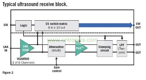 首先以超聲波設備為例來探討模擬性能需求。通過該范例,本文將介紹如何在性能、功耗、尺寸以及集成度之間進行權衡,并檢測雙極性與CMOS工藝技術的適用性。圖1是典型超聲波機器的系統方框圖,展示了傳輸與接收兩個部分。這兩個部分負責驅動傳感器與數字處理部分(未顯示),從而構成完整的超聲波設備。