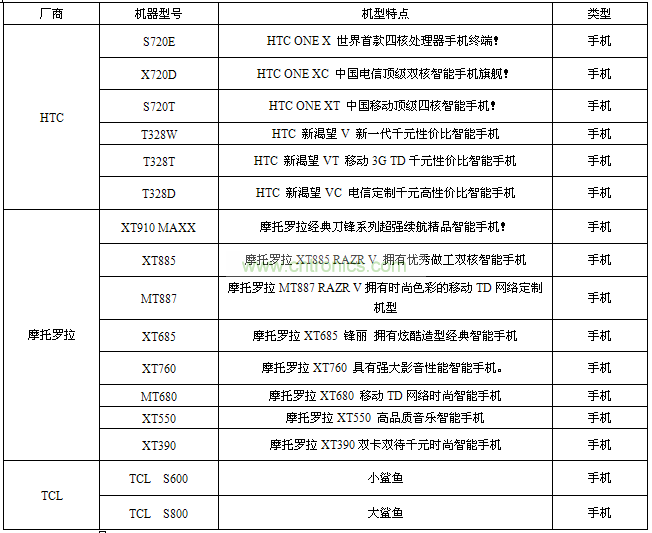 HTC將攜帶他們在MWC2012上推出的最新四核機皇ONE X系列參展;摩托羅拉將帶來8款最熱門的智能手機,從XT910 MAXX無窮電量的“肥刀”到最新的刀鋒V“彩刀”以及最新三防手機DEFY都有真機展出;
