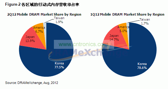 第二季行動式內存營收,三星半導體市占逼近全球60%,仍穩居龍頭之位,韓系廠商占全球行動式內存營收的77.5%,較第一季僅小幅減少1.1%。第三名的日商爾必達市占則是小幅下滑0.8%來到13.9%,美商美光科技則受惠于中低階智能型手機的成長,市占小幅成長至6.7%,位居第四。臺系DRAM廠亦在行動內存市場中試圖搶占一席之地,除了華邦電子之外,南科亦在本季營收當中初次嶄露頭角,目前比重雖然不高,但也為整個行動式內存的市場帶來不同的氛圍。值得注意的是由于下半年受到景氣不確定因素的影響,各家內存制造商在下半年生產與開發的計劃也逐漸轉趨于保守,謹慎應對自2009年以來最嚴峻的景氣寒冬。