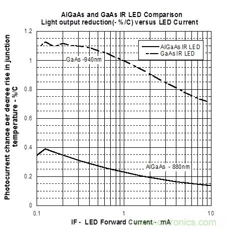 在 1mA 下工作時,GaAs IR LED 光輸出減少 1%/°C。 這意味著結溫升高 50 °C 時,LED 的輸出會降低 50%。 使用 AlGaAs IR LED,光輸出僅降低 0.225%/°C,因此,結溫升高 50°C 而光輸出僅降低 11%。