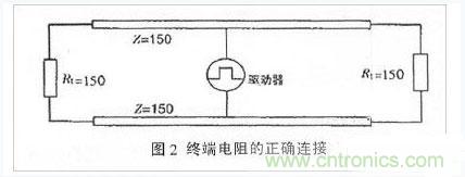 ②阻抗不連續,顧名思義,與光從一種媒質進入另一種媒質時所引起的反射是相似的。信號在傳輸線末端突然遇到電纜阻抗很小甚至沒有,信號在這個地方就會引起反射。消除這種反射最常用的方法,是在電纜的末端跨接一個與電纜的特性阻抗同樣大小的終端電阻,使電纜的阻抗連續。由于信號在電纜上的傳輸是雙向的,因此,在通訊電纜的另一端同樣要跨接一個相同大小的終端電阻,如圖2所示。