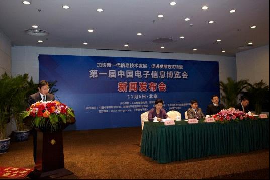 2012年11月6日下午,工業和信息化部與深圳市人民政府在北京召開新聞發布會,宣布2013年4月10日至12日在深圳市共同舉辦第一屆中國電子信息博覽會。工業和信息化部電子信息司副司長、中國電子信息博覽會組委會辦公室副主任安筱鵬出席會議并介紹了籌備舉辦第一屆中國電子信息博覽會的總體情況;深圳市經濟貿易和信息化委員會副主任、中國電子信息博覽會組委會辦公室副主任賈興東介紹了展館的總體安排;中國電子器材總公司副總經理、中國電子信息博覽會組委會辦公室副主任兼秘書長陳雯海,深圳市平板行業協會常務副會長、中國電子信息博覽會組委會辦公室副主任兼副秘書長許生介紹招展的進展情況。會議由工業和信息化部辦公廳新聞處處長張紅宇主持。新華社、中央人民廣播電臺、中央電視臺、中國電子報、人民郵電報、中國工業報等中央媒體和業內媒體,以及業內相關行業協會和重點企業參加了新聞發布會。