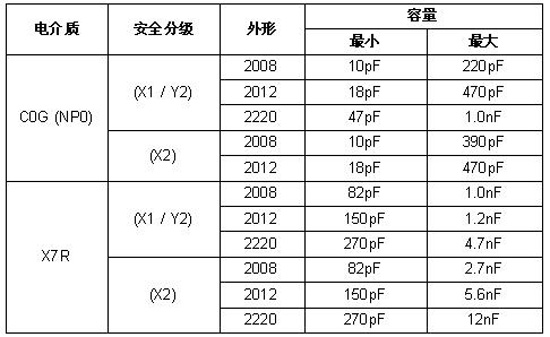 采用C0G(NP0)電介質的VJ Safety器件的容量低至10pF,-55℃~+125℃溫度范圍內的容量溫度系數(TCC)為0ppm/℃±30ppm/℃,每十年的最高老化率為0%。如果用戶需要更高的容量,采用X7R電介質的器件可提供12nF的容量,-55℃~+125℃溫度范圍內的TCC為±15%,在0VDC電壓下的每十年最高老化率為1%。電容器采用X1/Y2和X2安全分級,峰值脈沖電壓分別為5000V和2500V。