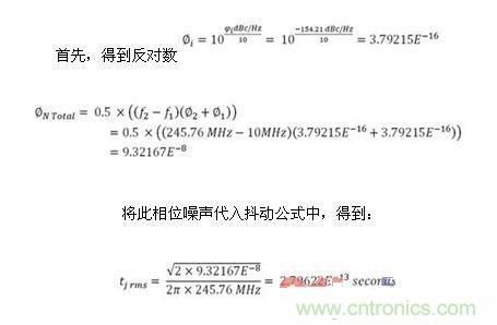振蕩器),并設(shè)置內(nèi)部寄存器,以生成AD9643的低抖動(dòng)時(shí)鐘輸出。根據(jù)時(shí)鐘輸入和相位噪聲的抖動(dòng)計(jì)算公式: