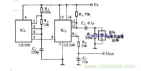 高分子電容型濕敏元件的應用電路如圖所示。它由兩個時基電路IC1、IC2組成。IC1及外圍元件組成多諧振蕩器,主要產生觸發IC2的脈沖。ICz和電容型濕敏元件及外圍元件組成可調寬的脈沖發生器,其脈沖寬度將取決于濕敏元件的電容值的大小。調寬脈沖從IC2的9腳輸出,經R5、C3濾波后成為直流信號輸出。它正比于空氣的相對濕度,其靈敏度為2mv/%RH。