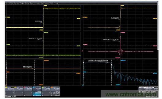 圖1:先將快速邊沿測(cè)試信號(hào)加到濾波器的輸入端(左上),然后用濾波器輸出(右上曲線)對(duì)它進(jìn)行微分(右中),最后求FFT的平均值(下右),就可以得到濾波器的頻率響應(yīng)。左下邊曲線中的頻譜展示了微分過(guò)的階躍輸入信號(hào)的頻率平坦度。