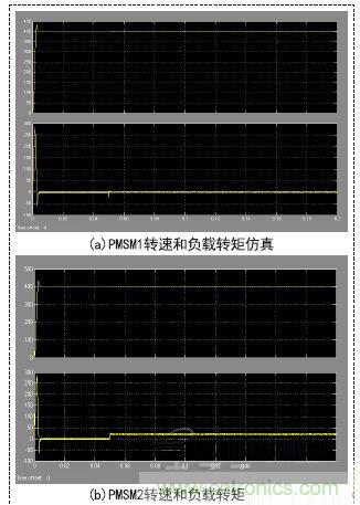 PMSM1轉速受到PMSM2負載改變的影響,出現微小的下降,然后快速恢復穩定,轉矩也出現微小的波動后迅速恢復穩定。說明基于svpwm調速的PID雙閉環控制系統有較強的魯棒性,雙電機間偏差耦合補償策略當某一電機負載改變時,另一個電機有良好的跟隨性能。