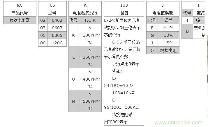 貼片電阻阻值誤差精度有±1%?±2%?±5%?±10%精度,常規用的最多的是±1%和±5%, ±5%精度的常規是用三位數來表示。 例512,前面兩位是有效數字,第三位數2表示有多少個零,基本單位是Ω,這樣就是5100歐,1000Ω=1KΩ,1000000Ω=1MΩ 。為了區分±5%,±1%的電阻,于是±1%的電阻常規多數用4位數來表示 , 這樣前三位是表示有效數字,第四位表示有多少個零4531也就是4530Ω,也就等于4.53KΩ。B5X,D1B,47R,24R,12D,30C不是 常規的標注?必須找生產廠家的規格書?貼片電阻有功率的大小如0805?1206等1/4W 1/2W電阻當然還有其他功率如1/8W的,大致上也就這三種最常見了。