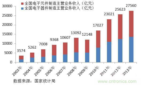 電子元器件是我國電子信息產業中的重要門類,產值比重約占電子信息產業的五分之一。2003-2013年,我國電子元器件行業增速迅猛,年復合增長達到了22.7%,從2003年的3574億元增長到2013年的2.76萬億元。其中,2013年電子器件制造和電子元件制造主營業務收入分別達到1.39萬億和1.36萬億元。