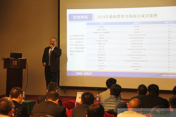 會議伊始,鼎陽科技董事長兼總裁秦軻先生進行了精彩致辭,總結(jié)了鼎陽科技在2014年取得的巨大成就,展望了鼎陽科技在2015年的宏偉前景,為鼎陽科技在新一年的持續(xù)高速增長擺下了棋陣。2014年鼎陽科技的銷售額增長了41%;MSO2000、SDS3000、SDM3000在取得了眾多工藝上的突破之后順利量產(chǎn)。去年,鼎陽科技美國分公司在克里夫蘭正式成立,為北美市場的下一輪增長做了堅實的鋪墊。2014年,鼎陽科技參加了海內(nèi)外的多個大型展會,標志著鼎陽科技正式立足于測試測量儀器領(lǐng)域主流品牌的行列。與此同時,鼎陽科技與廣州工業(yè)大學(xué)深度合作,建立了聯(lián)合實驗室,第一屆鼎陽杯也圓滿落幕,增強了鼎陽科技在高校用戶群體中的知名度,進一步鞏固了鼎陽科技在教育領(lǐng)域的影響力。