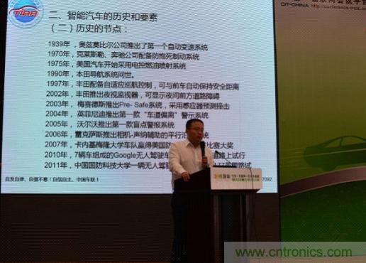 參加分論壇之“智能交通與車聯網產業發展”的主講嘉賓包括車載信息服務產業應用聯盟秘書長龐春霖,中國科學院微電子研究所副所長、中國科學院物聯網研究發展中心常務副主任陳大鵬,深圳市中興物聯科技有限公司總經理古永承先生等。龐秘書長表示在智能汽車領域隱藏著巨大的商機,隨著智能終端和手持終端交互的互聯化,主動安全措施的標配化等,隱藏的商機將被不斷發現并挖掘。陳大鵬主任從行業的融合、競爭的轉變、企業的轉型、汽車與車聯網四大方面就車聯網與新能源汽車做了詳細介紹。他表示,信息技術與傳統行業的融合可以為傳統行業開辟新的局面,未來的汽車必然是電子信息和軟件主導的新能源智慧車輛。