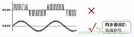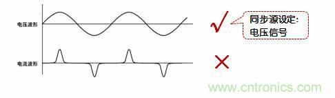 當被測對象是變頻器,其電流波形的畸變相比電壓波形較小時,請選擇電流信號作為同步源。
